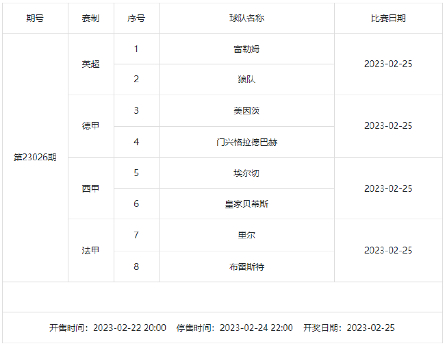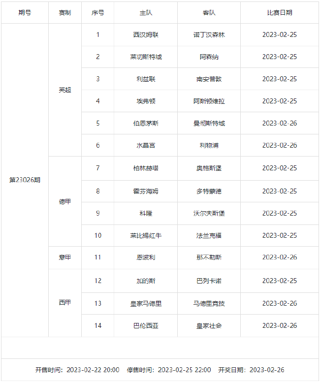 第23026期、第23027皇冠博彩期均为五大联赛赛事